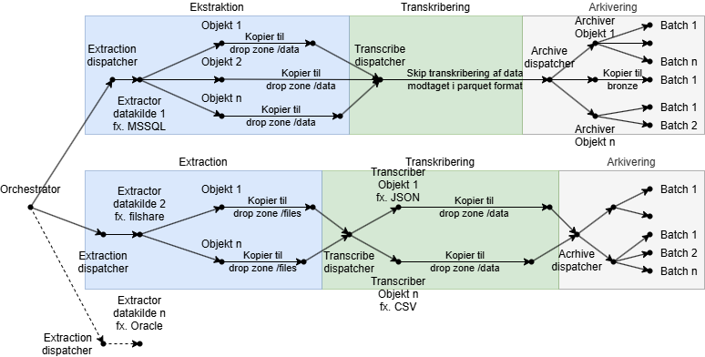 Datahandlingen i indlæsningslaget koordineres af en orchestrator og udføres parallelt for hver enkelt datakilde, der hver især behandles sekventielt i faserne ekstraktion (extraction), transkribering (transcription) og arkivering (archiving). I hver fase udvælger en dispatcher henholdsvis den påkrævede extractor, transcriber eller archiver til at udføre databehandlingen. Extractors understøtter specifikke typer af datakilder såsom MSSQL og Oracle databaser eller SFTP og SMB fil-servere, mens Transcribers understøtter specifikke kildedataformater såsom CSV- og Excel-filer og konvertering af disse til parquet. Objekterne i hver enkelt datakilde behandles parallelt under både ekstraktion, transkribering og arkivering.
